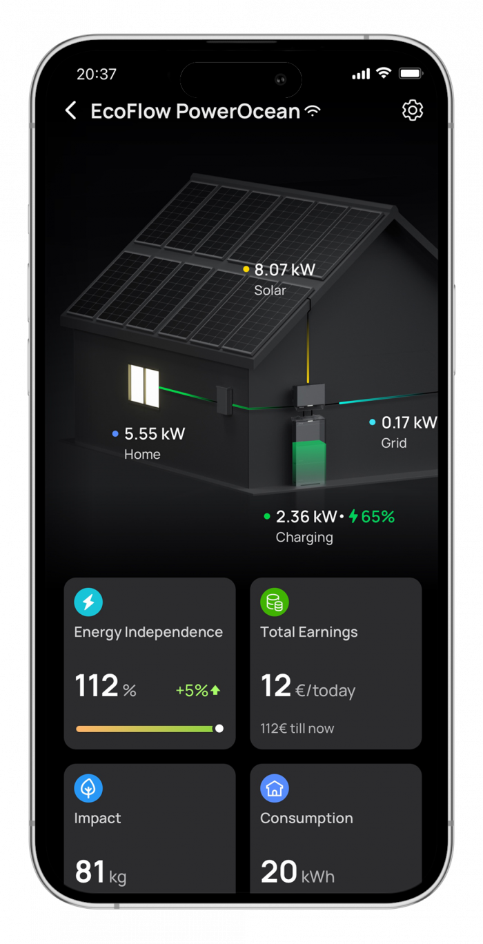 Zusätzlich bietet die EcoFlow-App volle Kontrolle und Transparenz. Überwachen Sie den Energieverbrauch in Echtzeit, optimieren Sie Ihre Energieeffizienz und maximieren Sie Ihre Produktivität, indem Sie den EcoFlow PowerOcean mit einer Solaranlage kombinieren.